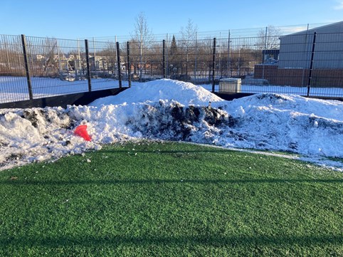 Kommunen er ryddet sneen så langt ud til siden, som det er dem muligt, men hele banearealet har ikke været muligt at rydde på hverken kunstgræsbane 1 eller 2. Derudover er der blevet saltet igen.